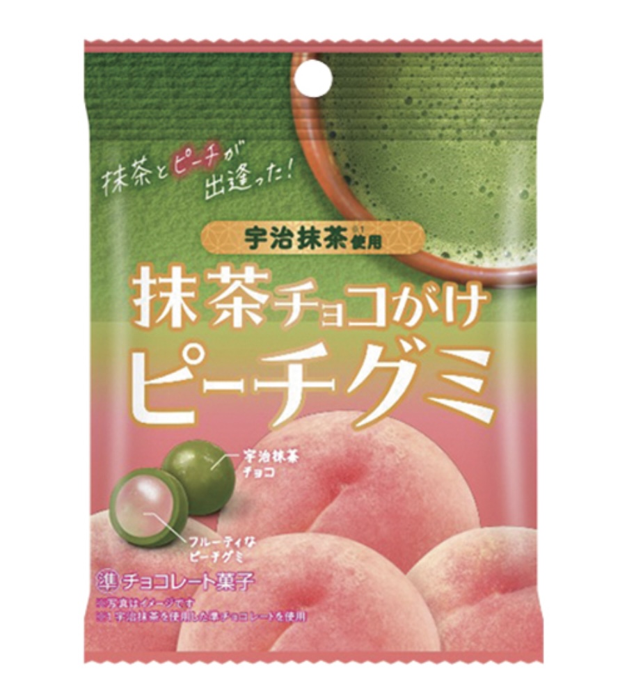 宇治抹茶チョコのほろ苦さとピーチグミのフルーティな甘みの組み合わせが新しいおいしさのグミチョコレートです。