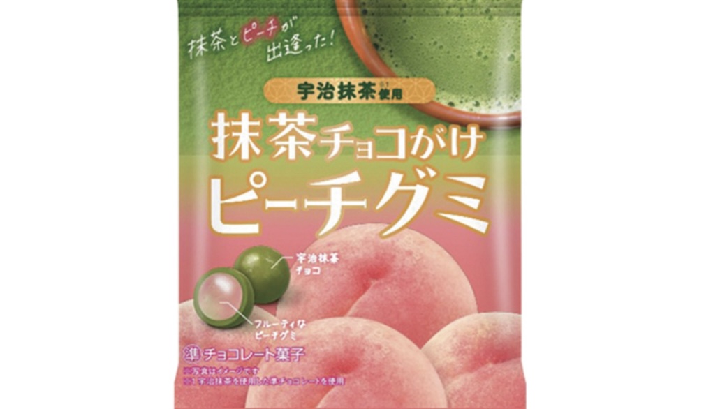宇治抹茶チョコのほろ苦さとピーチグミのフルーティな甘みの組み合わせが新しいおいしさのグミチョコレートです。