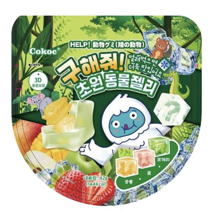 皮をむくと、中からは海・陸のどうぶつの形のグミがぷるんとでてきます♪外側の皮部分は少し固めのグミになっていて、中はぷるんとした、フルーツゼリーのような食感。