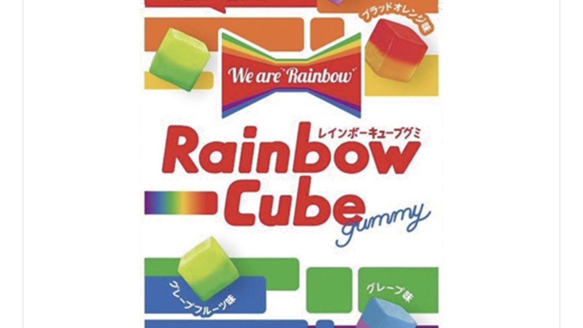 ブラッドオレンジ、グレープ、グレープフルーツ味の3種類の味が楽しめるキューブ型の2色グミです。色の組み合わせは赤とオレンジ、青と紫、黄色と緑の3パターンがあり、繋げると6色のレインボーカラーを楽しめます。