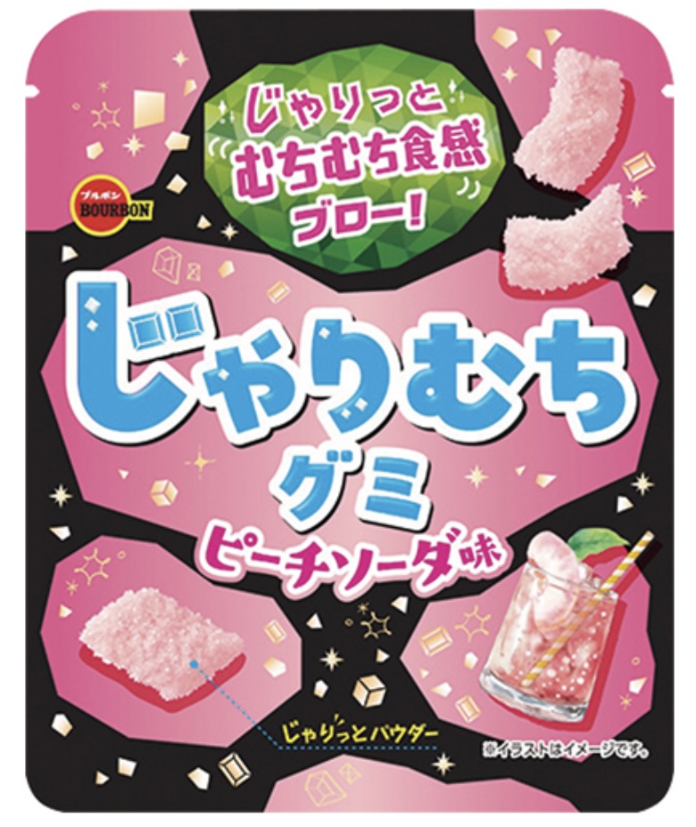 甘酸っぱじゃりっとしたザラメパウダーとむちむちグミの“じゃりむち食感”が楽しいピーチソーダ味のグミです。