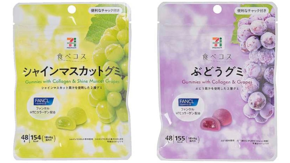【セブンプレミアム】ファンケル ぶどうグミ/シャインマスカットグミ その他 2025.10.12 ブランド セブンプレミアム 商品概要 吸収されやすいサイズまで分解したファンケルHTCコラーゲンを配合した、ぶどう/シャインマスカット果汁使用の2層のトロぷに食感グミ。 ※2025年10月14日から全国のセブンイレブンにて販売開始 ラインナップ