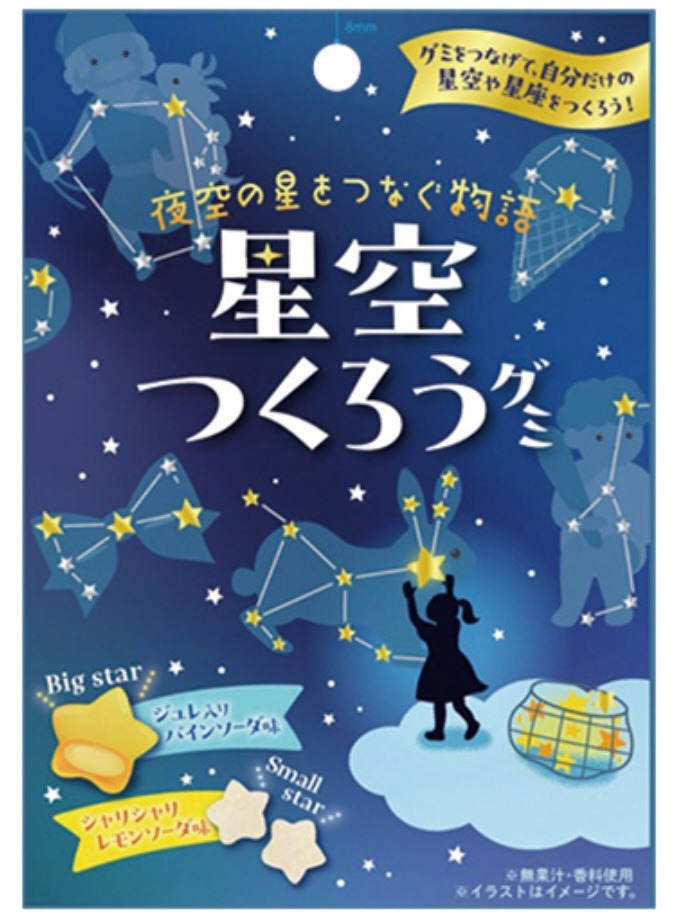大きい星型のジュレ入りパインソーダ味と小さな星型のシャリシャリレモンソーダ味の2種アソートグミです。グミをつなげて、自分だけの星空や星座がつくれます。