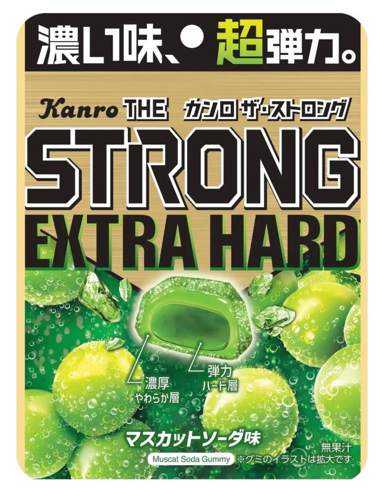 濃厚な味わいの“濃厚やわらか層”で“弾力ハード層”を包み込む「Wストロング製法」により、他のハードグミとはひと味違う“逆弾力”の「やわカタW食感」をお楽しみいただける「カンロ ザ・ストロング」シリーズの第3弾!