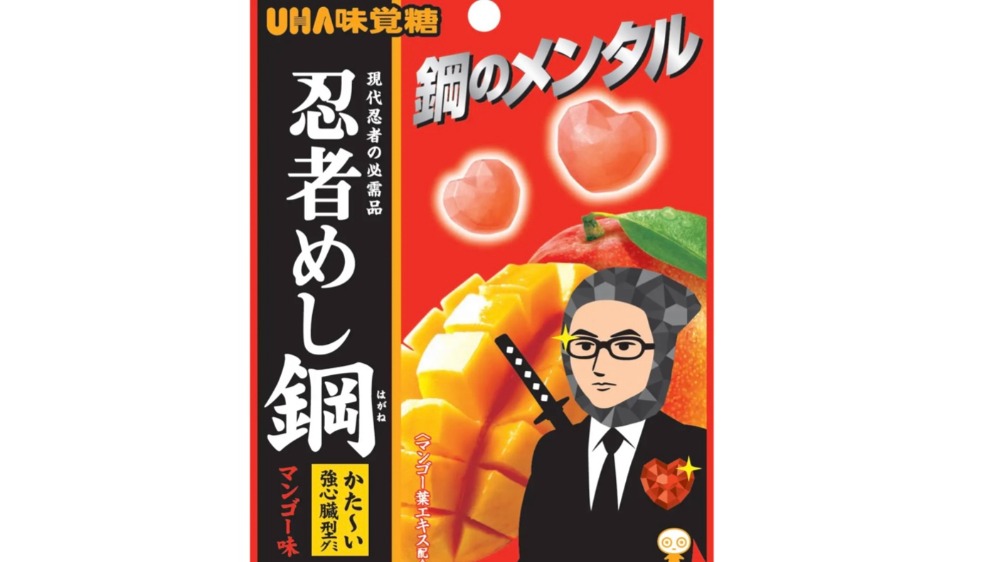 鋼のようなハードな噛み心地が特長の「忍者めし鋼」シリーズの新フレーバー、マンゴー味です。「鋼のメンタル」の名の通り、強心臓をイメージしたハート型グミです。