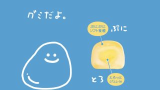ジュレinのぷにとろ食感と、やさしい甘さの乳酸菌ドリンク味。日々に追われるあなたのこころをほぐす、ゆる~いグミ。