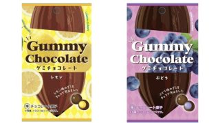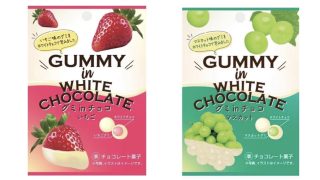 ソフトないちご/マスカット味のグミをホワイトチョコレートを包んだチョコグミ。ダイソーにて販売中。